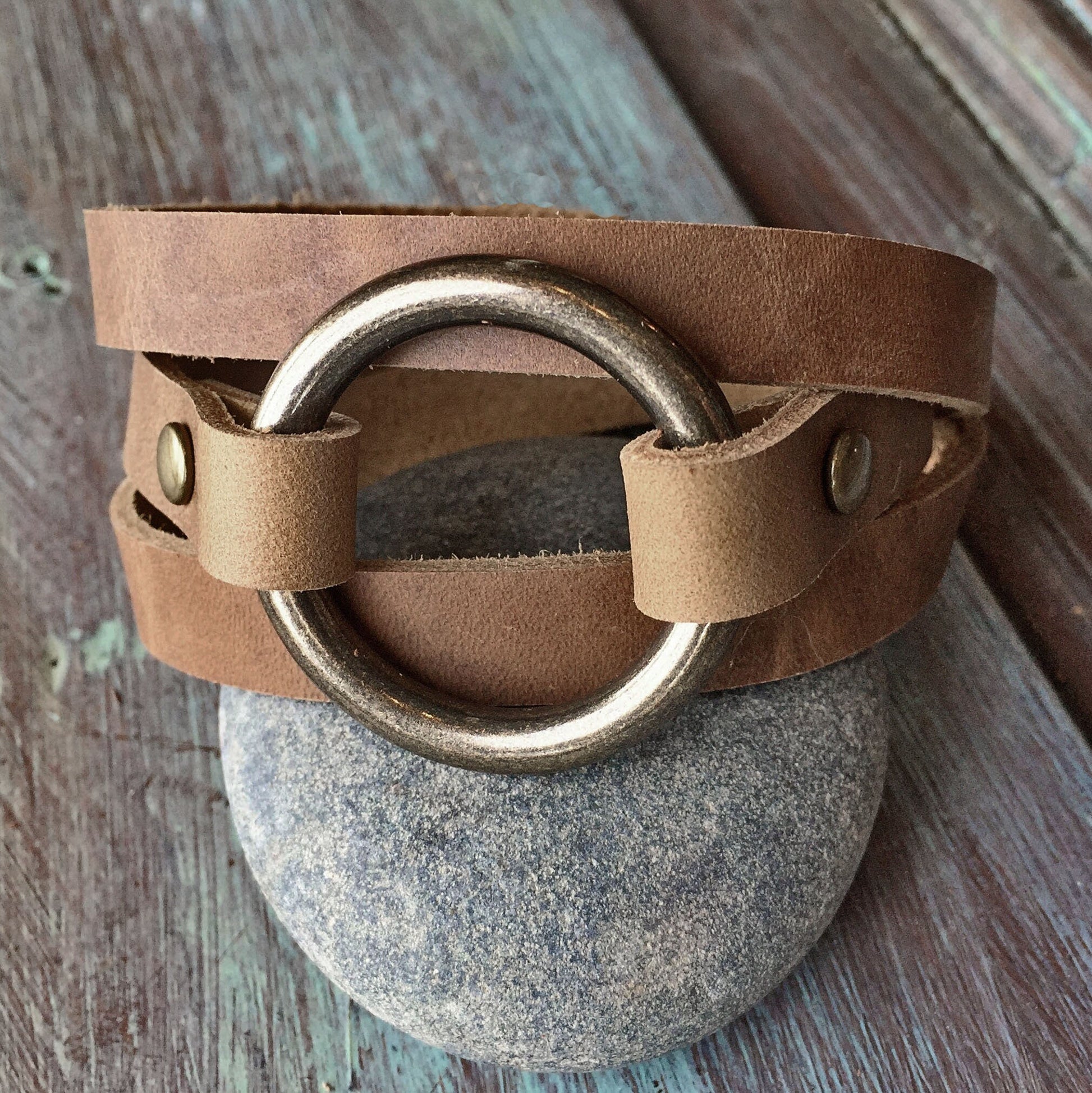 This triple wrap leather bracelet features 3/8" wide leather strips and a 1 1/2" solid o-ring in matte nickel or antique brass for a simple look that isn't bulky on your wrist. It is sure to become a staple in your wardrobe and is a comfortable statement piece for any season.