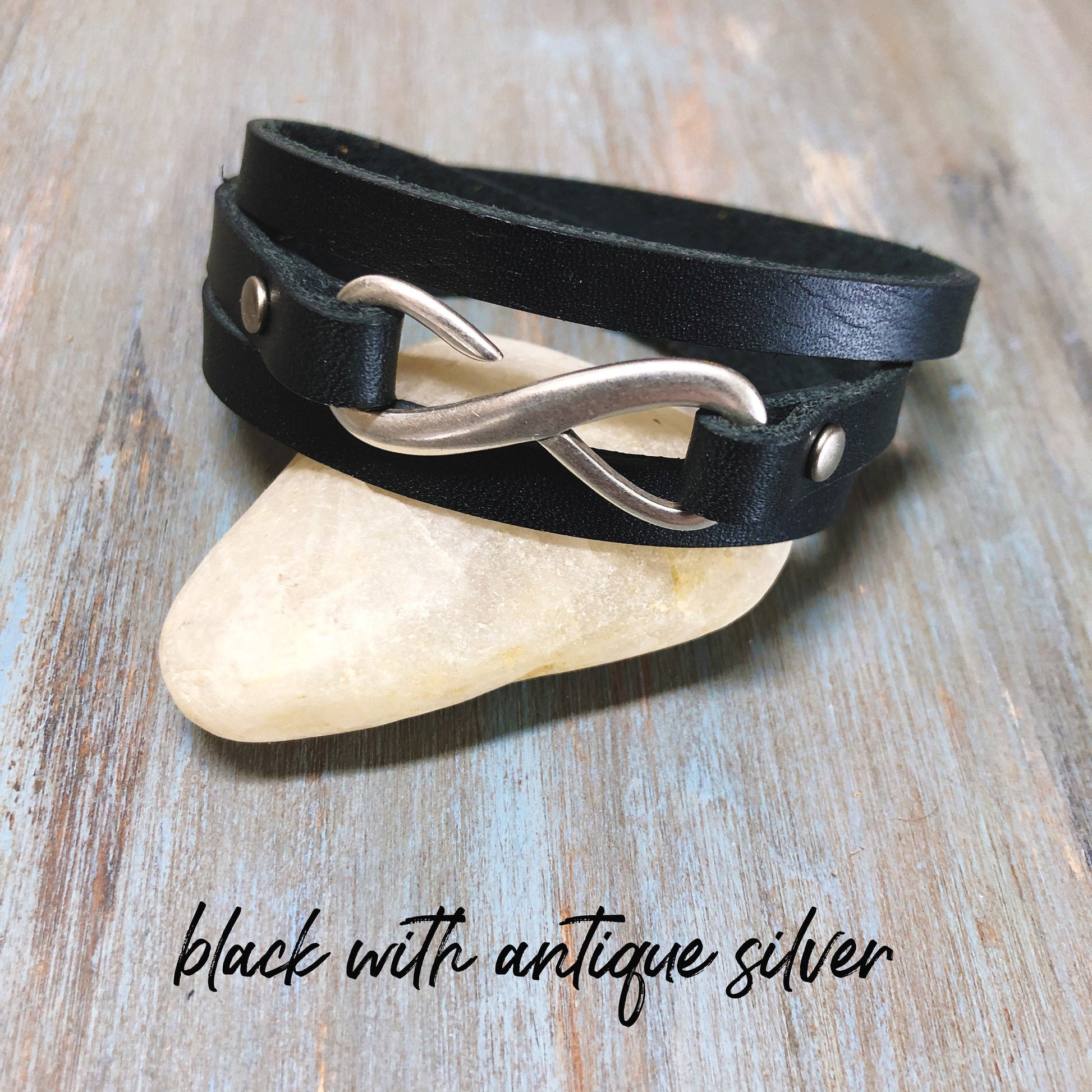 This Infinity Leather Wrap Bracelet is the perfect addition to your jewelry staples. Made with 1/4" strips of handcut genuine leather leather and featuring a 1.5" infinity charm in antique silver with matching rivets. The bracelet wraps around the wrist 3 times. A simple loop closure slips into the infinity ring. Super easy to put on. No help needed.