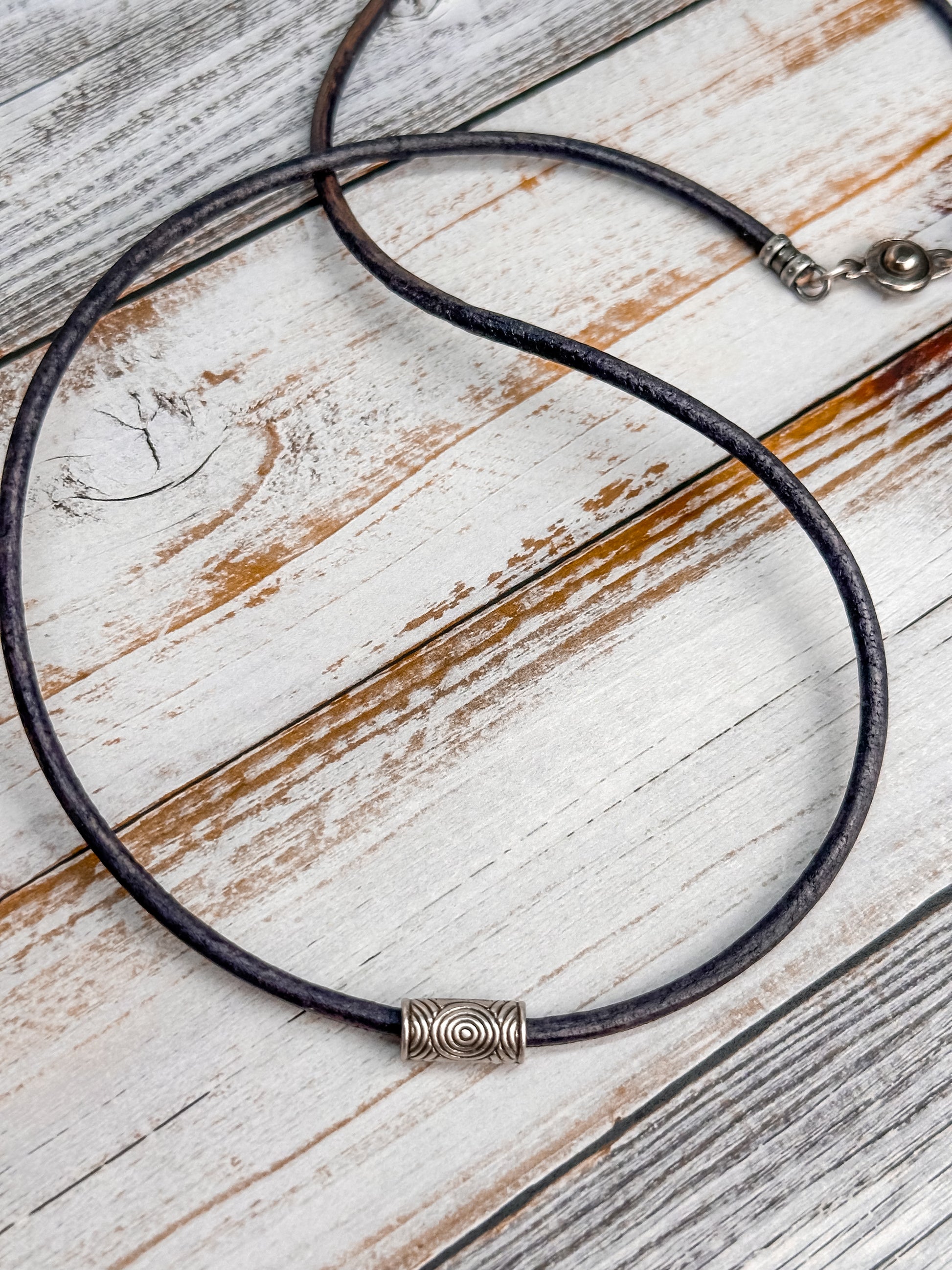 Unique and fun leather cord and metal tube necklace. I use a 13x6mm long copper patina or antique silver tube paired with genuine 3mm leather cord. The beautifully patinaed blue copper-plated and antique silver tubes features concentric circles that give it a unique but timeless design.