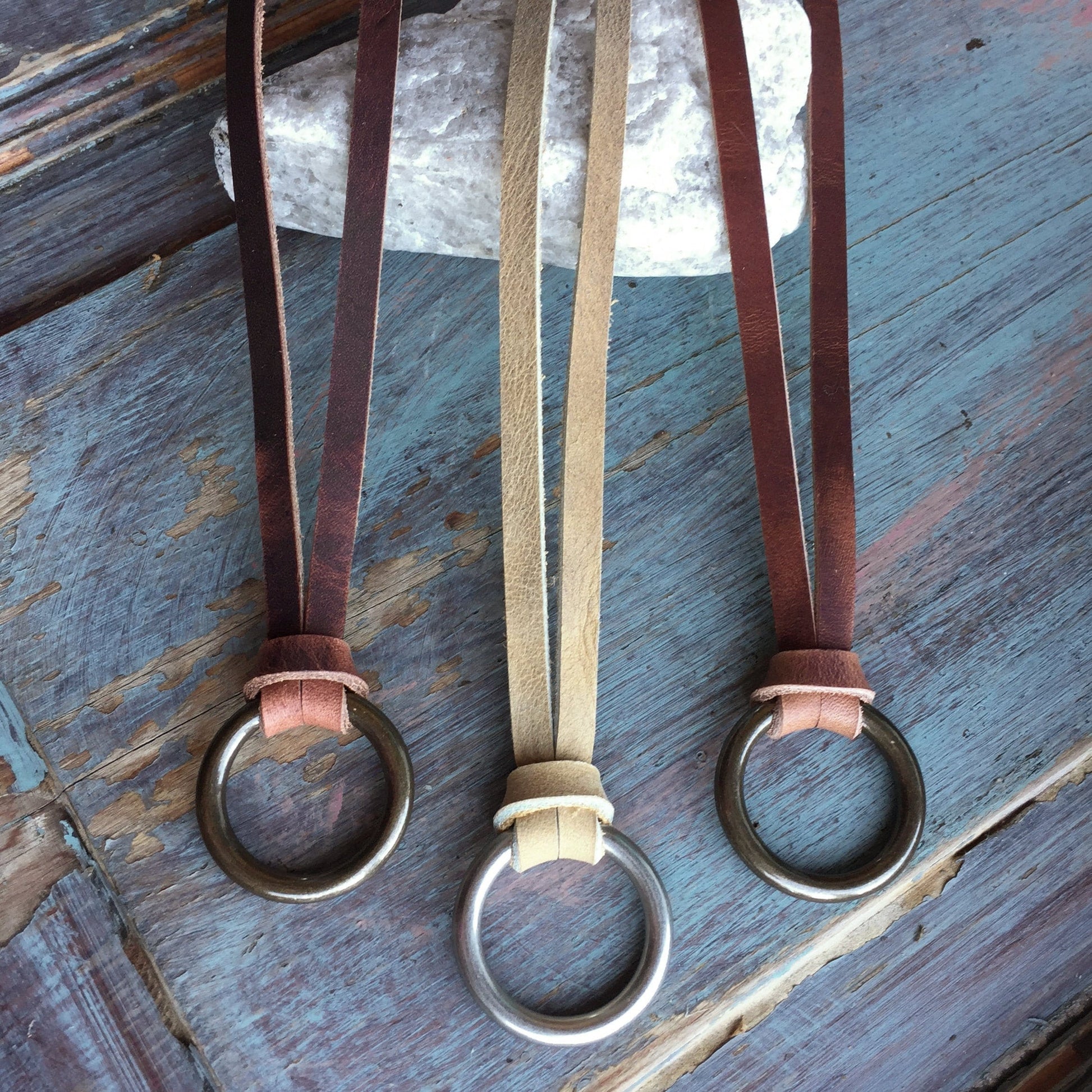 Modern and minimalist - this leather o ring necklace for women and men. Handmade with 1/4" strips of genuine hand cut leather. The ring is a 1.5" solid brass o-ring in antique brass, shiny brass, matte nickel or shiny nickel finishes.
